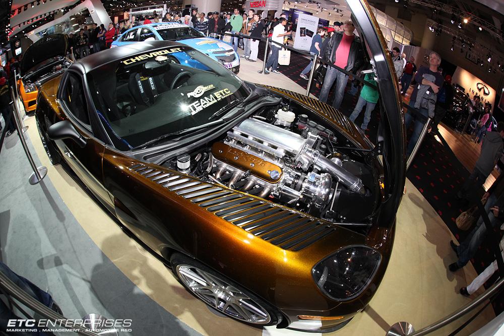 Canada. The great white north. The country that brought us back bacon, Molson beer and Ron Fellows is also home to Elite Tuners of Canada (ETC) and their Gold Rush colored C6 Corvette. The tuning company made their first appearance at the 2011 Canadian International Auto Show in Toronto last week with a display of two cars in front of the Chevrolet area. Dubbed the “Top Tuner 5” project, the Corvette and its Chevy Cruze counterpart “Top Tuner 5.5” turned a lot of heads with the race-inspired tuning projects.