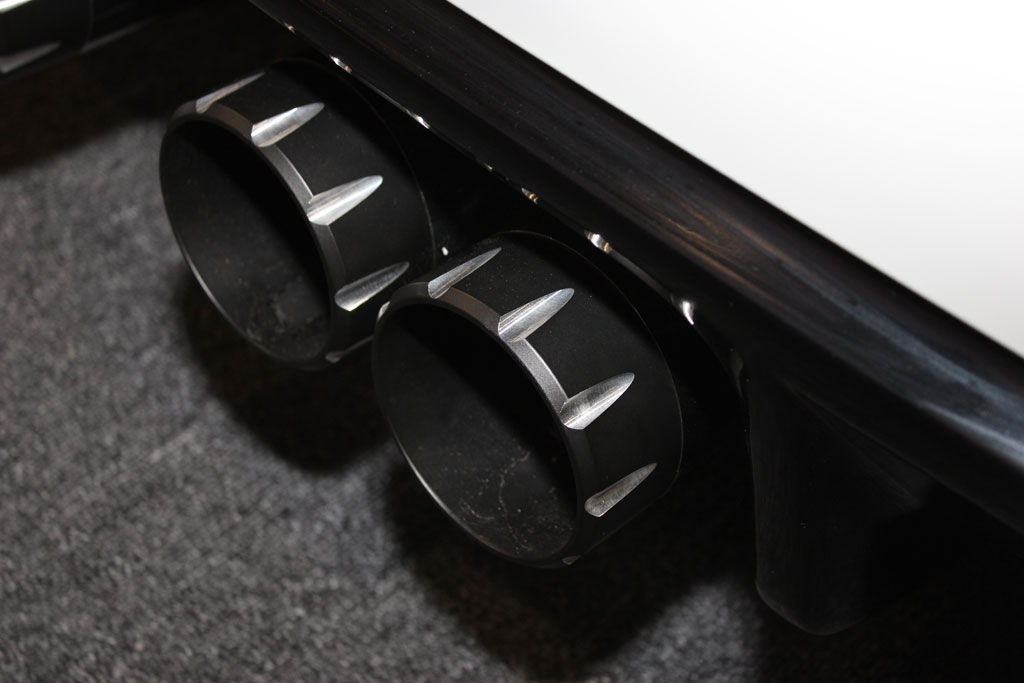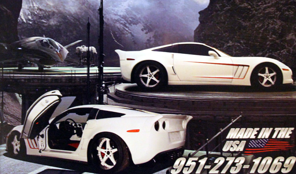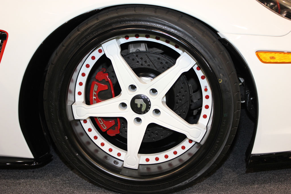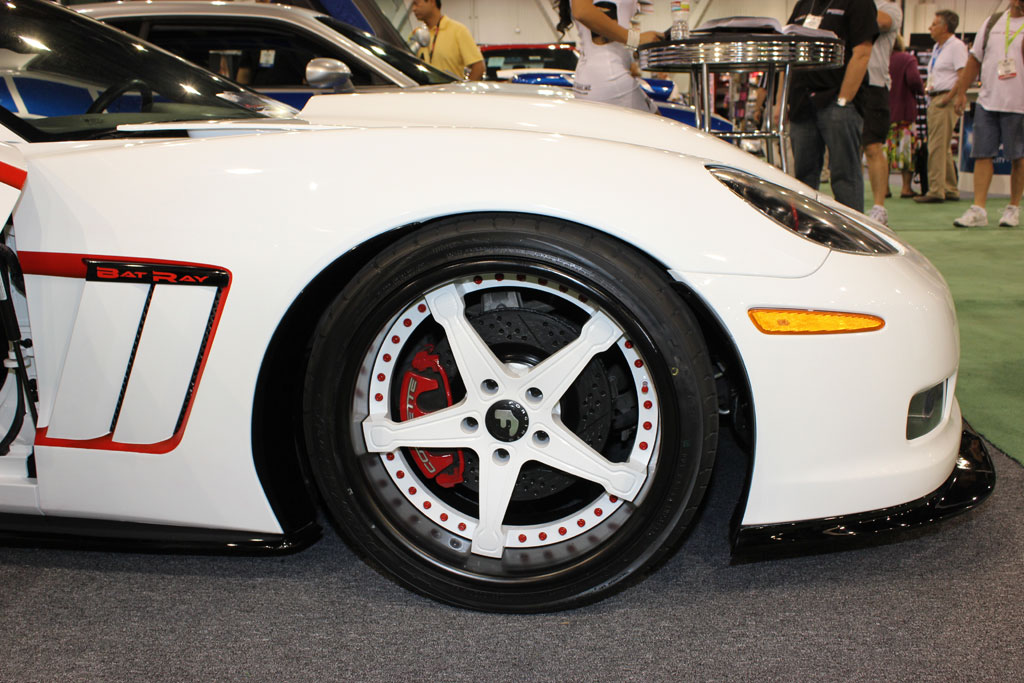 Going with the bat ray theme, the C6 Corvette was given an elongated rear spolier and a unique rear window treatment. The Corvette was given the widebody update with Grand Sport fenders front and back while the stock hood was replaced with a raised hood from RK Sport. Under that hood is an Edelbrock E-Force supercharger and a Bassani custom exhaust. Forgiato provided the 19 and 20 inch deep dish 5-spoke wheels in white which are fitted with Toyo tires. Barris Kustoms did the ground effects and rear spoiler.
