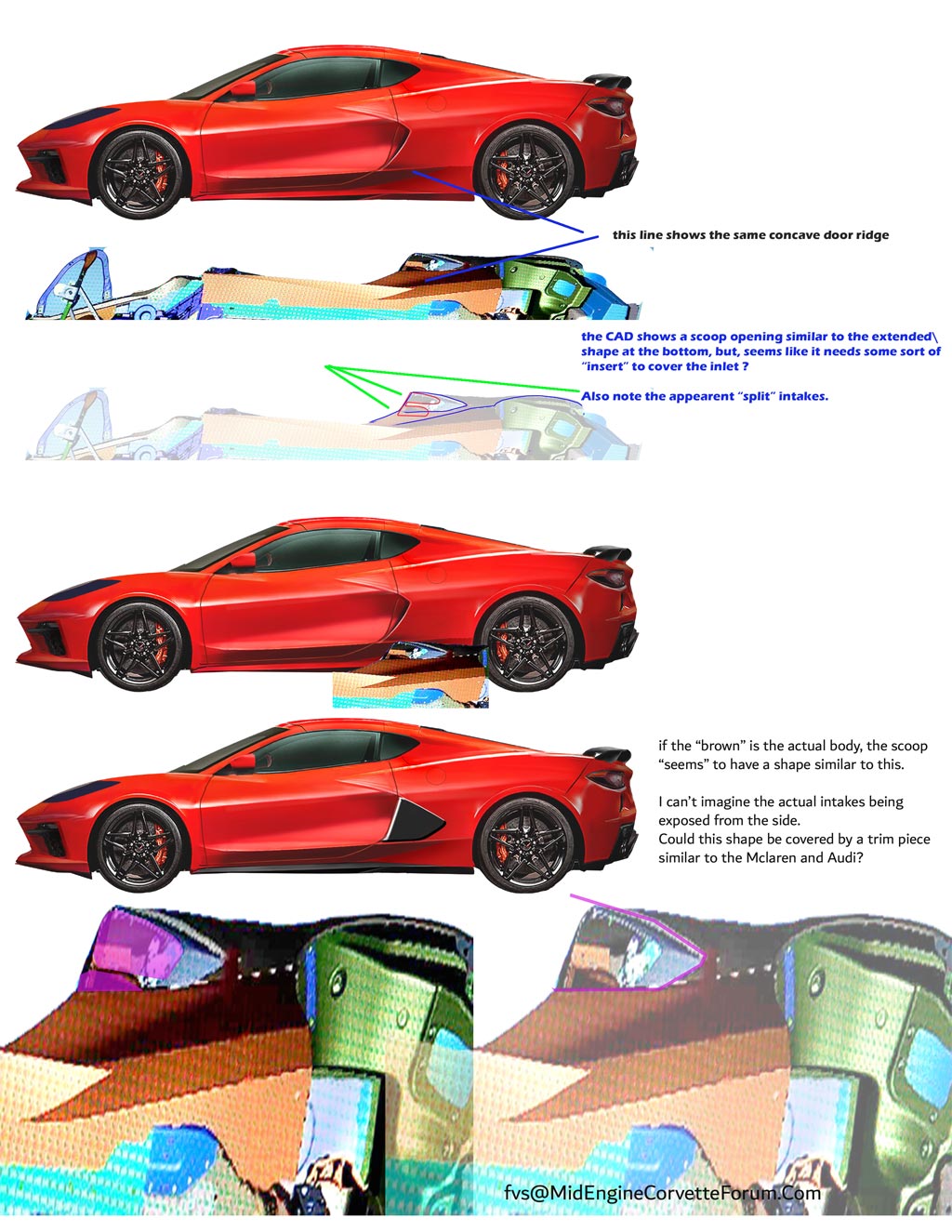 We’ve been diligently checking youtube and other places for new C8 photos or videos but like I said, it’s been quiet. Too quiet in my opinion, so let’s shake the trees with a couple new photos from FVS and the MidEngineCorvetteForum.com. In these series of photos, FVS explains some of the things he sees in the leaked CAD images and how they apply to a render. I also like how he brings in other manufacturers as well to show their design ideas.