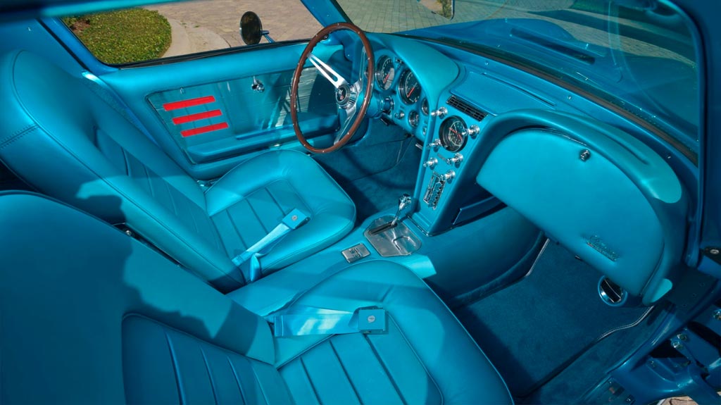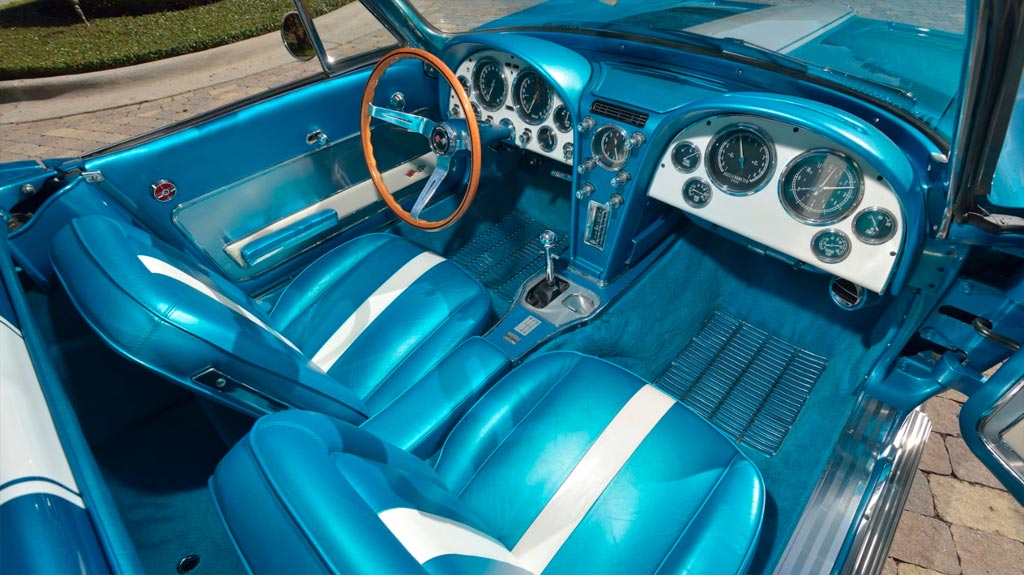 The 1964 coupe wears blue metallic paint and also showcases many items from Corvettes future. It’s the first time we saw what we now know as Astro Ventilation. Note the lack of vent windows on the door glass. It also has disc brakes, a 3-speed transmission, and 1970-style egg crate front fender gills. It was a mainstay of the Bob McDorman collection for many years.