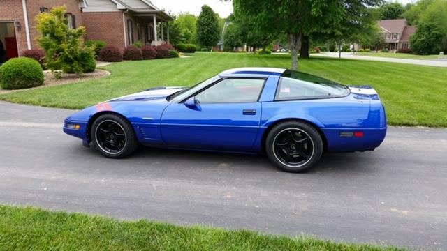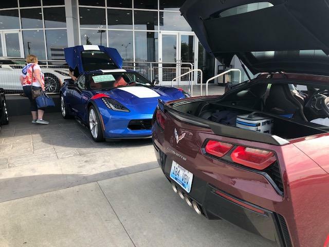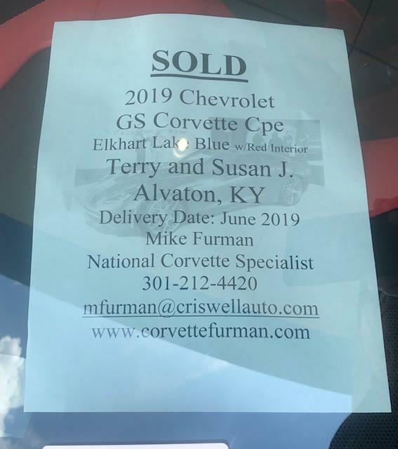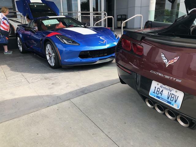 ~Terry and Susan J. are from Iowa originally but after Terry retired they moved to Alvaton, KY as they are Lifetime Members of the Corvette Museum in Bowling Green, KY. I see Terry every year when I visit the Museum because Terry helps out and does Security at big events for the Corvette Museum. He and I spoke in April at this year’s Corvette Bash and I gave him a sight unseen trade-in value on their 2016 Corvette. They bought their first new Corvette in 1985 and their new Elkhart Lake Blue 2019 Grand Sport is the 6th Corvette they have owned. This ’19 GS will join their 1996 Admiral Blue/Red Grand Sport and their Blue 1963 Corvette GS Tribute car(see pics below). Equipment list: two-tone red interior, Heritage Pkg, Auto transmission, White Center Stripe, red hash marks, CF painted mirrors, Navigation /PDR and 2LT Pkg. This week they drove the 650 miles up from KY in the 2016 Corvette and Thursday morning we traded Corvettes. Terry is having the wheels chromed so that way the whole barrel gets chromed! Two super nice active Corvette folks that drive everywhere in their Corvettes. They participate in many Museum in Motion Road tours so say hello and check out their Corvette the next time you see them.