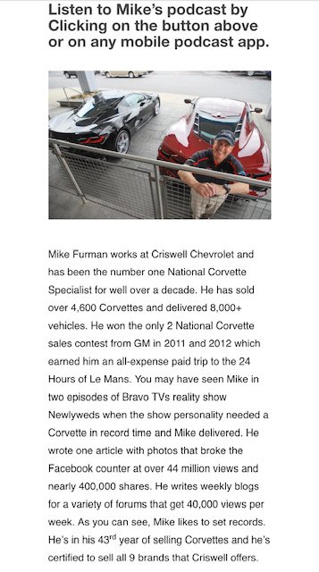 Criswell Chevrolet’s Mike Furman delivers new Corvettes to his customers who come from all across the country to work with the nation’s top individual Corvette seller.