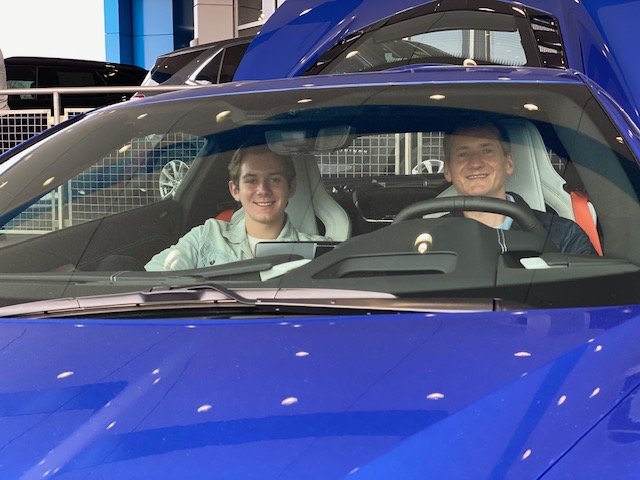 ~Robert M. of Tolland, CT traded in his 2018 Corvette and the last time he brought his Father, this time Dad stayed home and Roberts’s son Brandon joined him for the 360 Mile trip. Robert factory ordered an Elkhart Lake Blue 2020 Corvette coupe with sky cool gray interior. To say the two of them were pumped up for the Corvette ride home is an understatement!