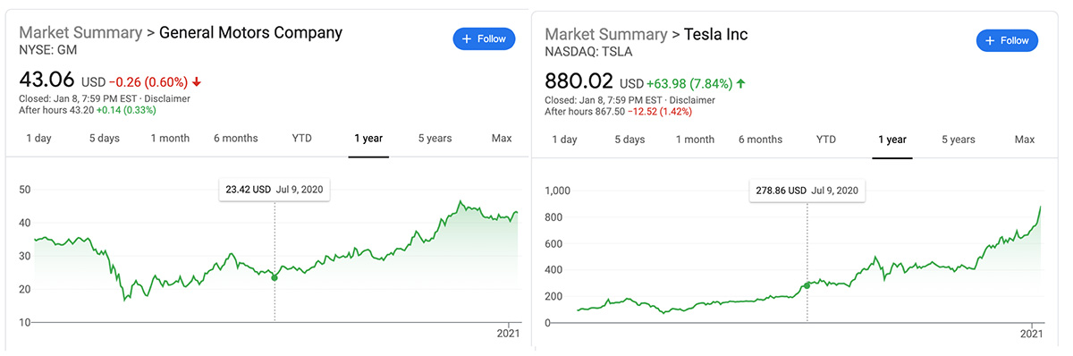 Buckle up folks because this thing really jumps around between second and fourth! The founder and CEO of Tesla (an electric car company that eked out a net profit of $331 million on 139,300 deliveries in the most recently reported quarter of vehicle production), Elon Musk is officially the richest person in the world after TSLA stock grew at an unprecedented rate in 2020. Meanwhile, General Motors, a company that brought in $4.05 billion (with a B!) from the sale of 665,192 vehicles in that same quarter of business, is trying to be excited about their stock price sitting at about $8 per share higher than it was pre-pandemic.