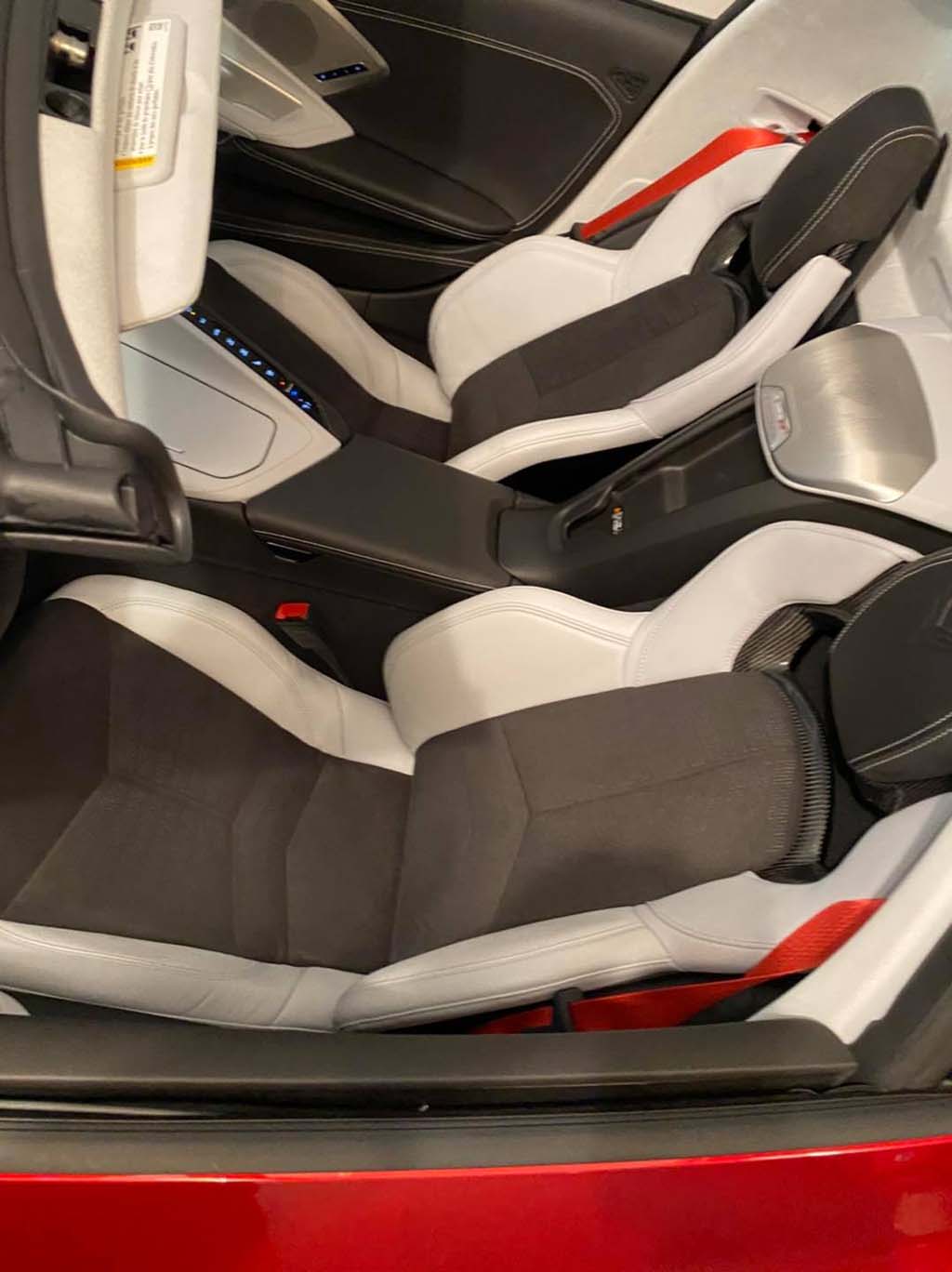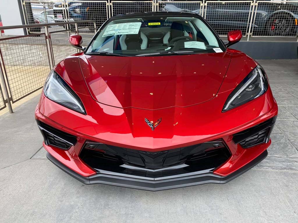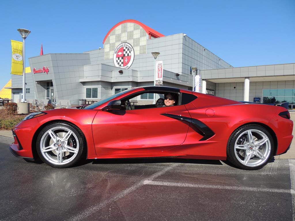~John C. of Pasadena, Texas factory ordered his new 2021 Corvette Z51 coupe for Museum delivery and yesterday was red carpet day. John ordered Red Mist with Adrenaline Red/Black interior. Equipment list: GT2 buckets, transparent top, color combo override, front lift, Z51, magnetic ride, CF painted mirrors/spoiler and 2LT pkg.