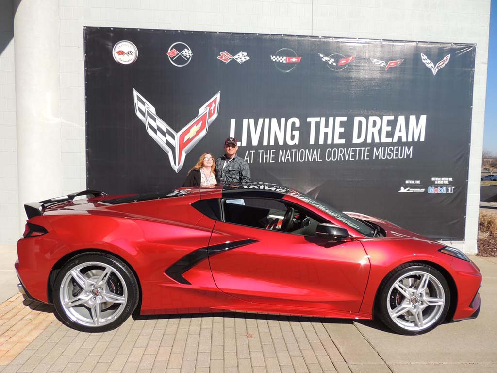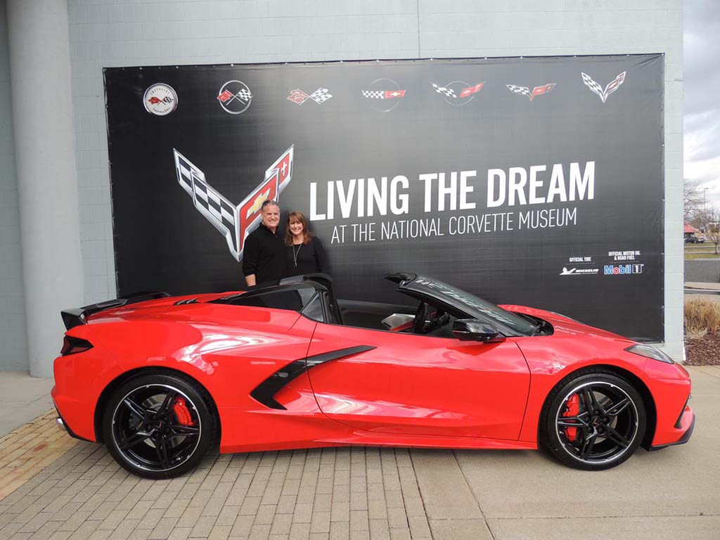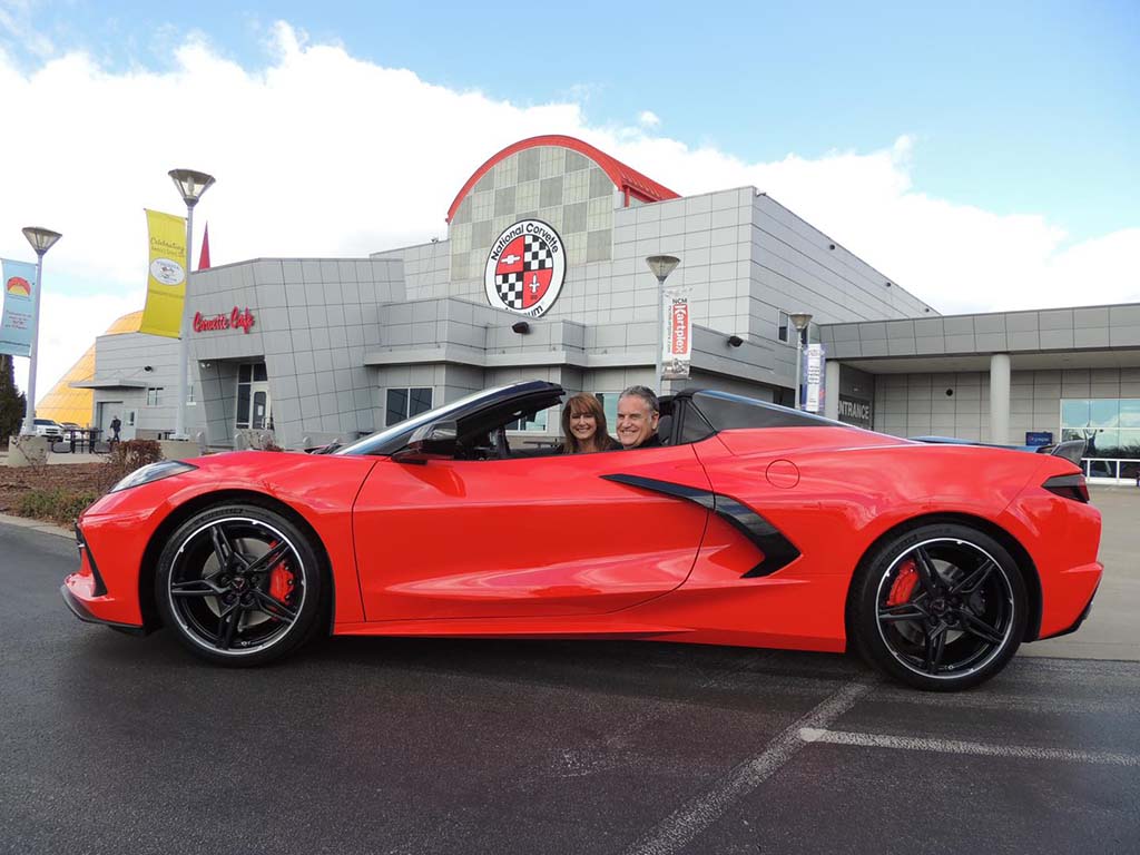 ~Greg and Lisa R. of San Antonio, Texas placed their Corvette order with me and they wanted to do the Museum experience…this past week was their delivery day! The red carpet was rolled out for them both to enjoy. Equipment list for their 2021 Z51 Torch Red convertible: 3LT pkg, Two-tone adrenaline red/black interior, CF Painted Nacelles and roof, front lift, CF Instrument panel, bright red calipers, CF Painted wheels, visible CF Grille insert, custom interior trim, cf painted mirrors/spoiler and much more.