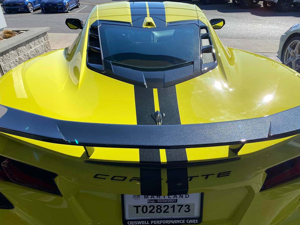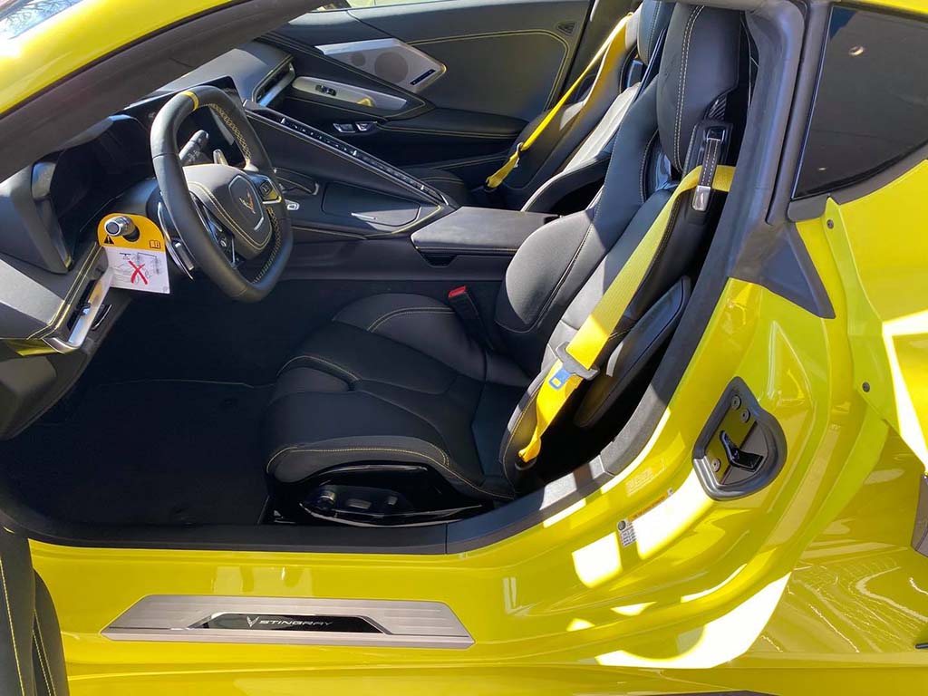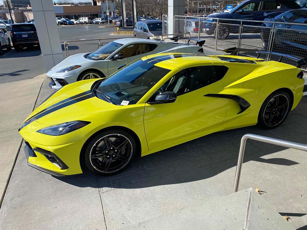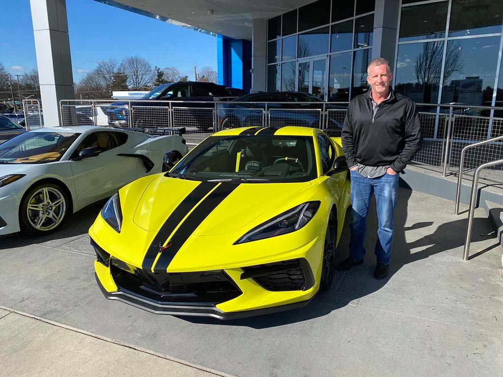 ~David H. of Southwest Ranches, Florida was referred to me by a previous customer from Florida that David knows and he waited 16 months for today. David flew up to BWI and completed his paperwork process in under 25 minutes and was back on the road South in no time flat. David was watching as I finished up several of my 14 deliveries yesterday and couldn’t believe how I handled so many deliveries at once. David had our service department install the high wing spoiler on his 2021 Corvette coupe and it looks great especially on the Accelerate Yellow metallic paint with black features. Equipment list. 3LT pkg, Black Competition sport seats, yellow seat belts, yellow stitching, CF full length stripes, magnetic ride, cf painted wheels, CF painted mirrors, engine appearance pkg, Z51 pkg, and much more. 1,000 mile ride home will be a breeze in his new C8!