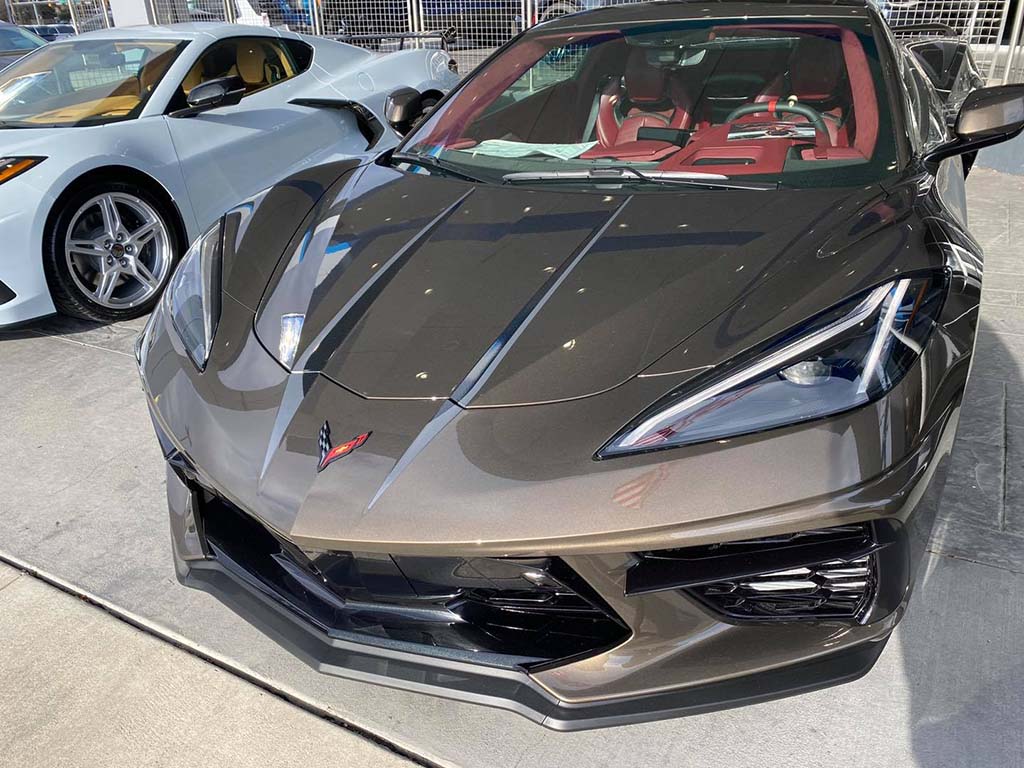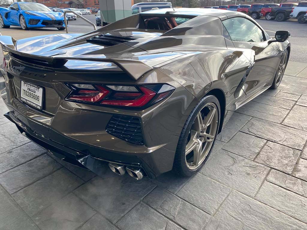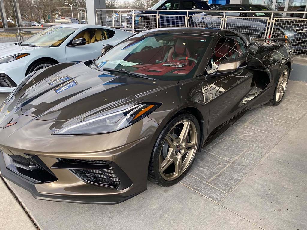 ~Robert F. of Weddington, North Carolina factory ordered a Zeus Bronze 2021 Corvette Z51 Convertible with the Morello Red dipped interior and the Performance Pewter 5 spoke wheels. Great combo that is sure to be an attention getter! I gave him a sight unseen trade value on his 2016 Corvette convertible and he and his buddy drove up Friday night and stayed close by. Equipment list: 3LT pkg, CF/midnight silver stinger stripe, front lift, magnetic ride, Z51 pkg and much more. I had him on the road quickly for the 430 mile ride home to North Carolina.
