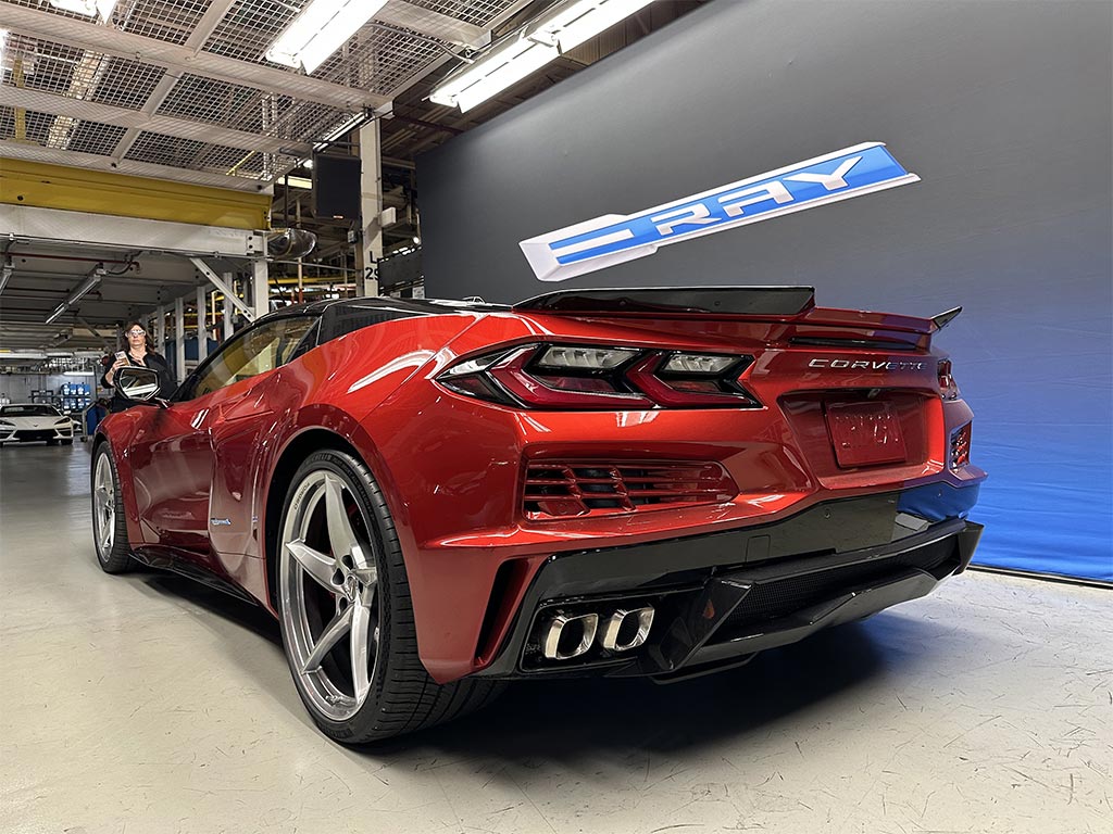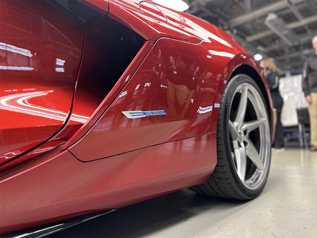The 2024 E-Ray was shown inside the plant and it was parked in front of an E-Ray banner.
