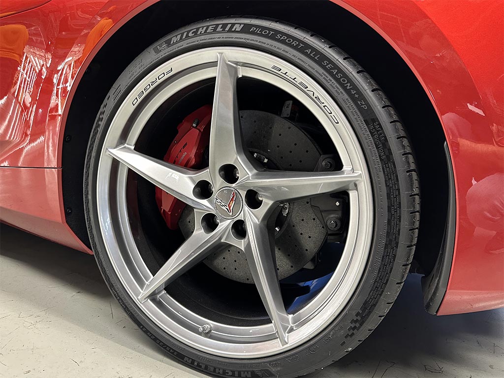The Red Mist Convertible is outfitted with the polished five-spoke wheels, bright E-Ray badging and exhaust tips, Black Nacelles and Roof, and Edge Red brake calipers. Inside the car we see the 3LZ dipped Natural Interior.