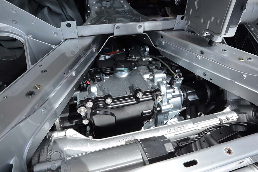 Thankfully, Chevy brought three E-Rays wearing the new exterior colors for 2024. They include Riptide Blue, Cacti, and Seawolf Gray Metallic. The fourth car was the E-Ray cutaway chassis which gives us a better understanding of how Chevy packaged its 160-hp front drive motor and the 1.9 kWh battery pack in the center tunnel.