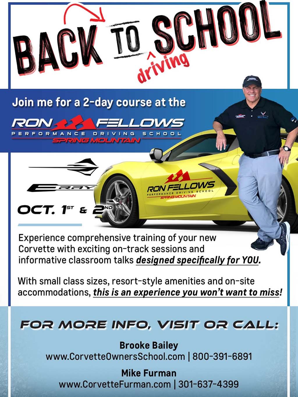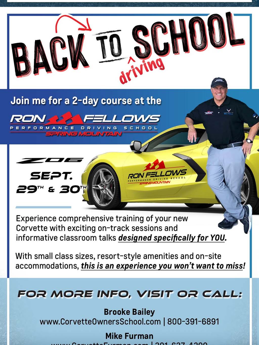 ~Corvette Owners school at Spring Mountain Racetrack in Pahrump, Nevada for my Fall classes are now open to sign up. September 29th-October 2nd. I will be there all week hosting 70+ of my customers. Check the dates in the first two pictures and call Brooke Bailey to sign up. GM pays 60%+ for this incredible experience and your cost is $1,000. Call Brooke Bailey for all the details.
